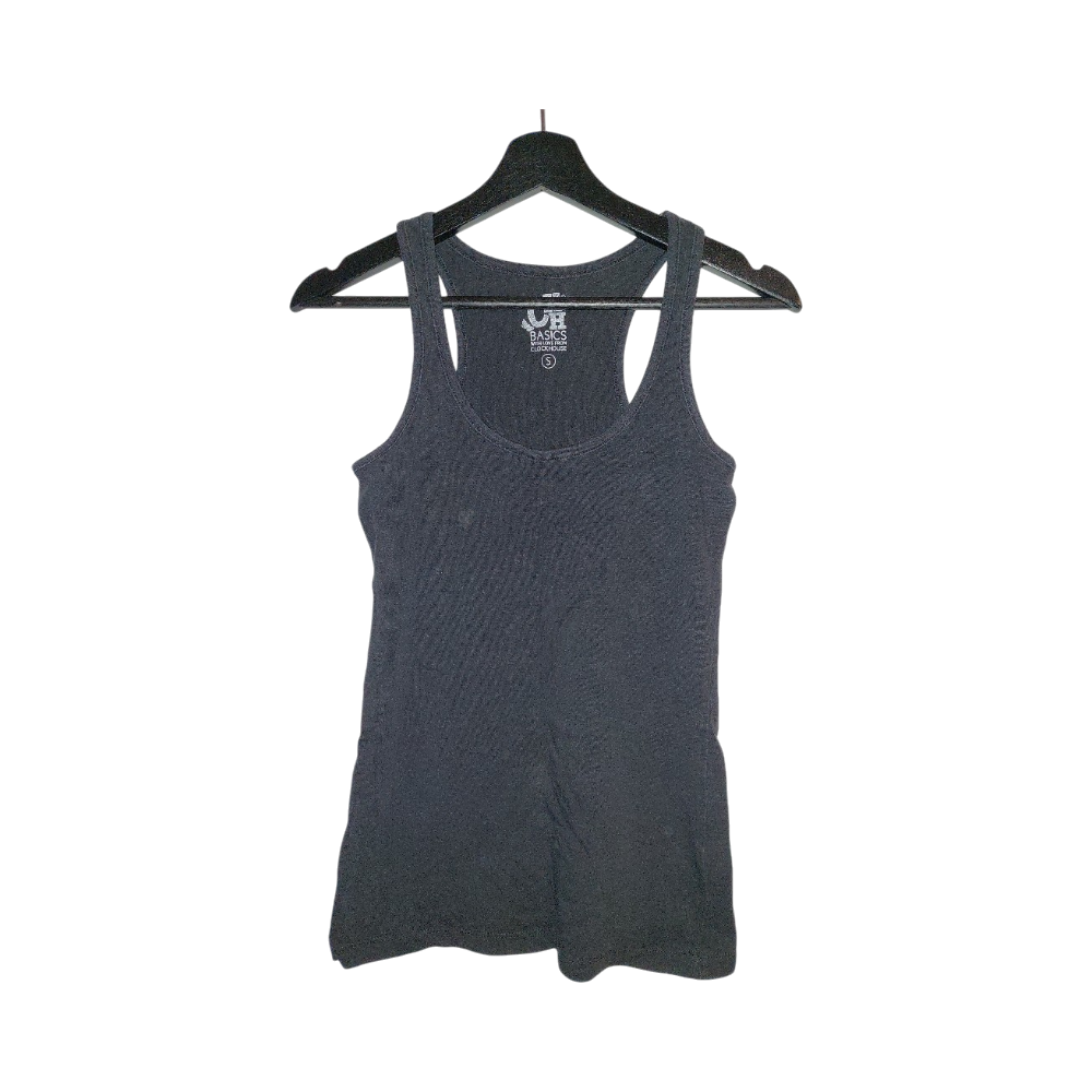Slim-fit ribbed racerback tank top, basic wardrobe staple.