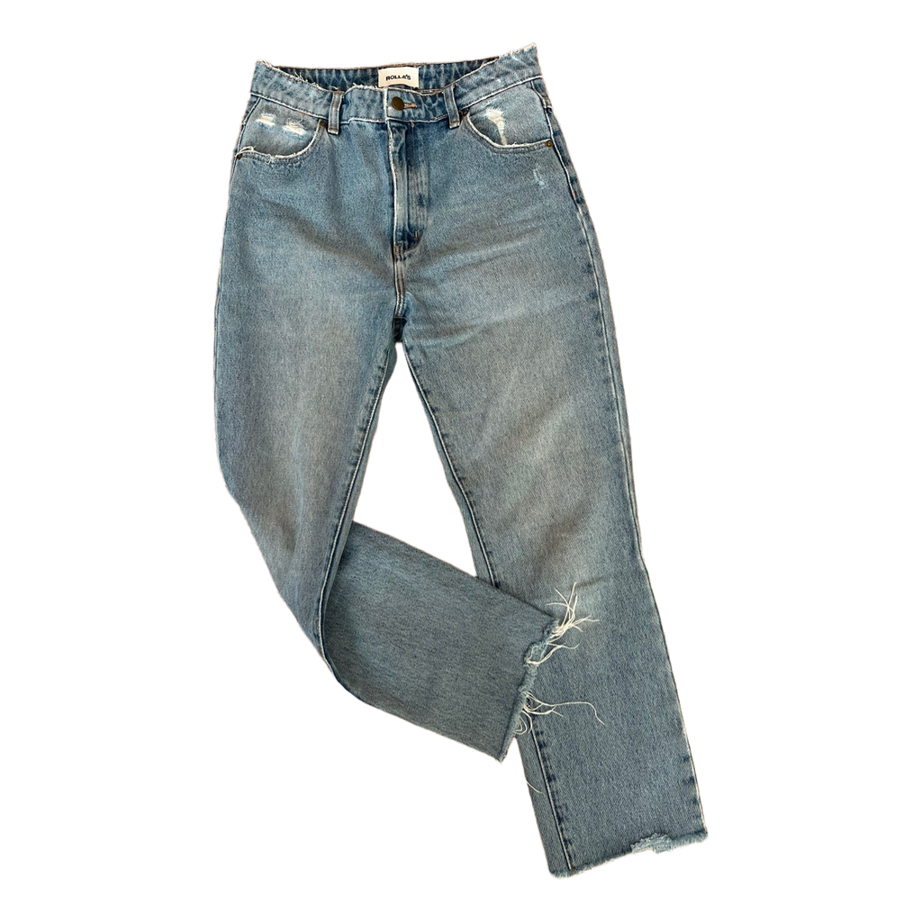 High-waisted relaxed style jeans, size 28". Good used condition, small wear as shown in the photo, does not affect use. Leg inner length about 68 cm and waist circumference about 74 cm