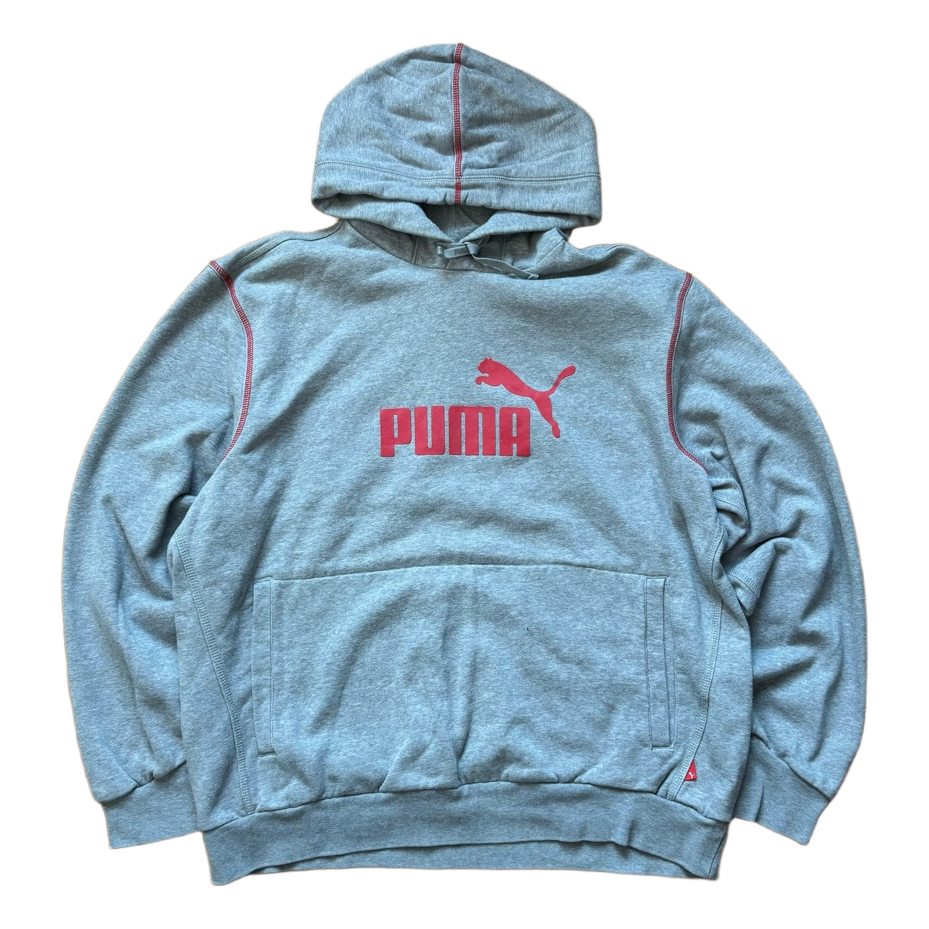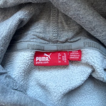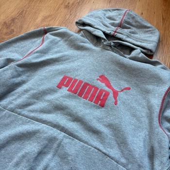 Grey Puma hoodie with red logo. Features a hood and a front pouch pocket. Size XL.