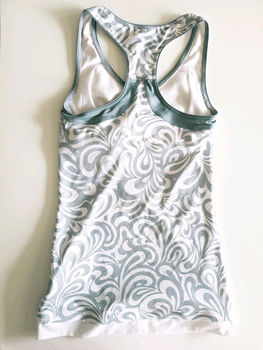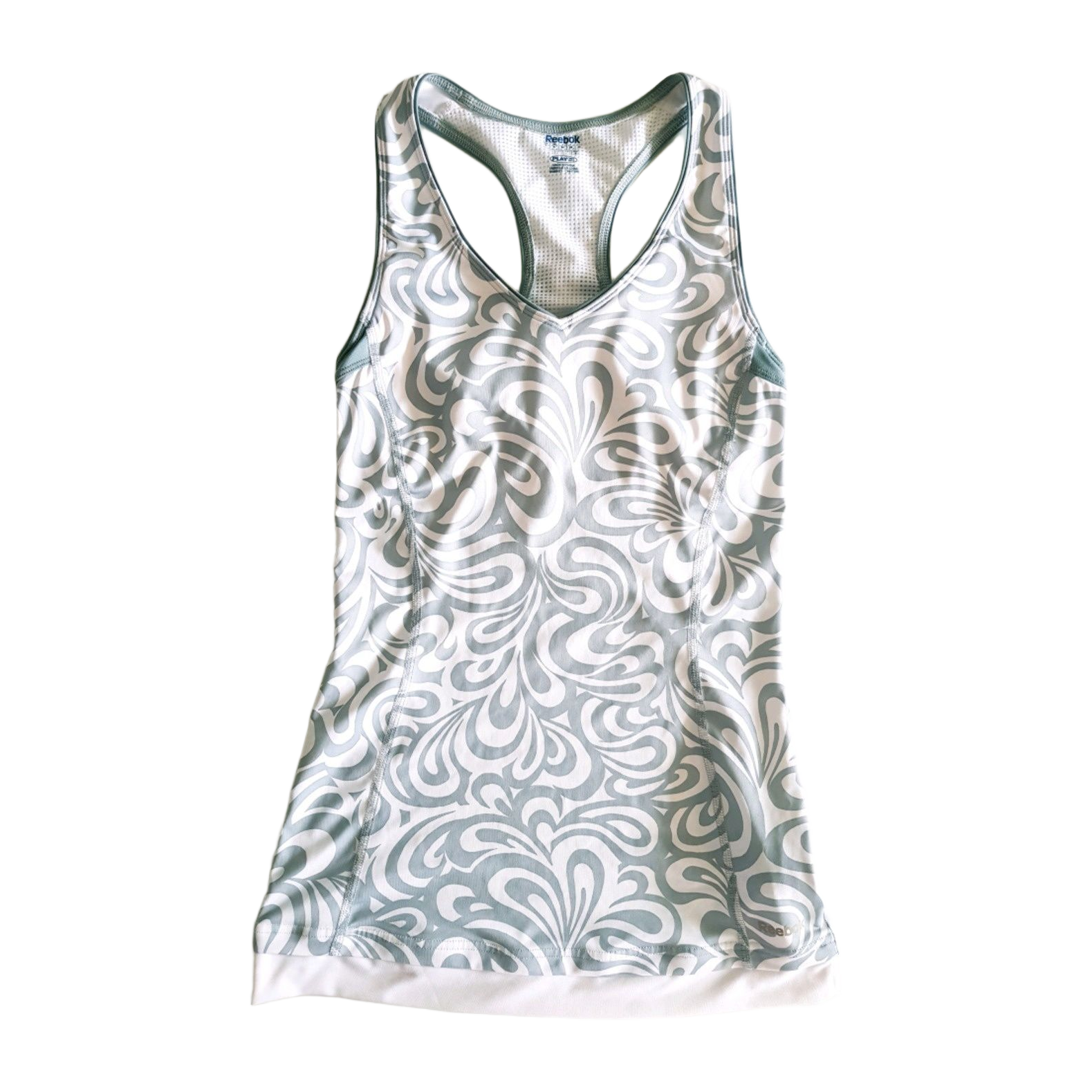 Good as new functional sport top with inside bust top for added support for the bust. Classic model, high quality, stretchy and comfortable, technical material. Beautiful white and silver pattern. Used once, washed once (just is a bit too small for me). Flawless condition. Label says S but XS is true size. #reebok #sportswear #sporttop #racerback
