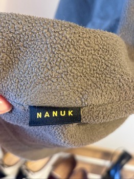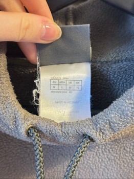 Grey fleece hoodie with drawstring hood and front pocket. Features brand logo on the chest. Size M.