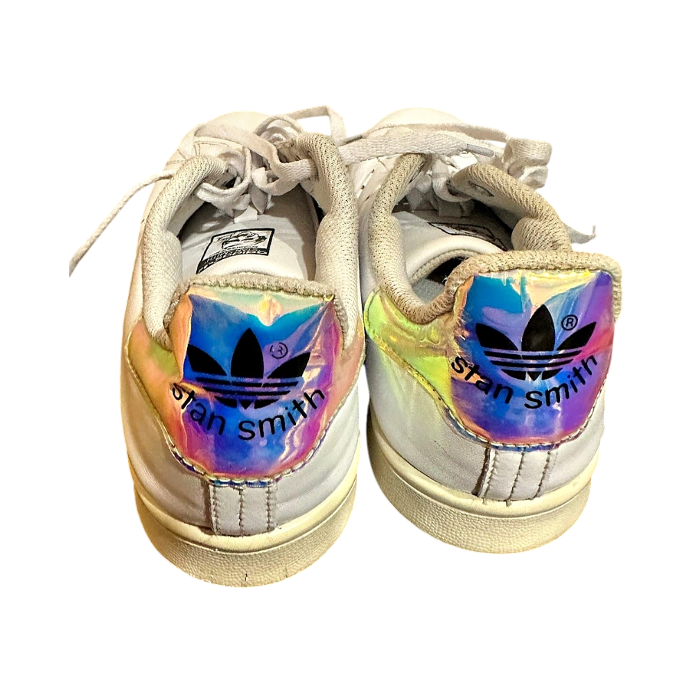 Classic white sneakers with colorful holographic accents.