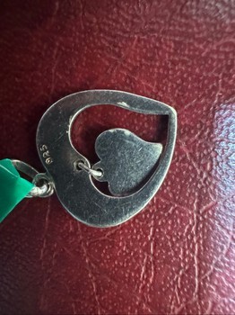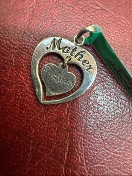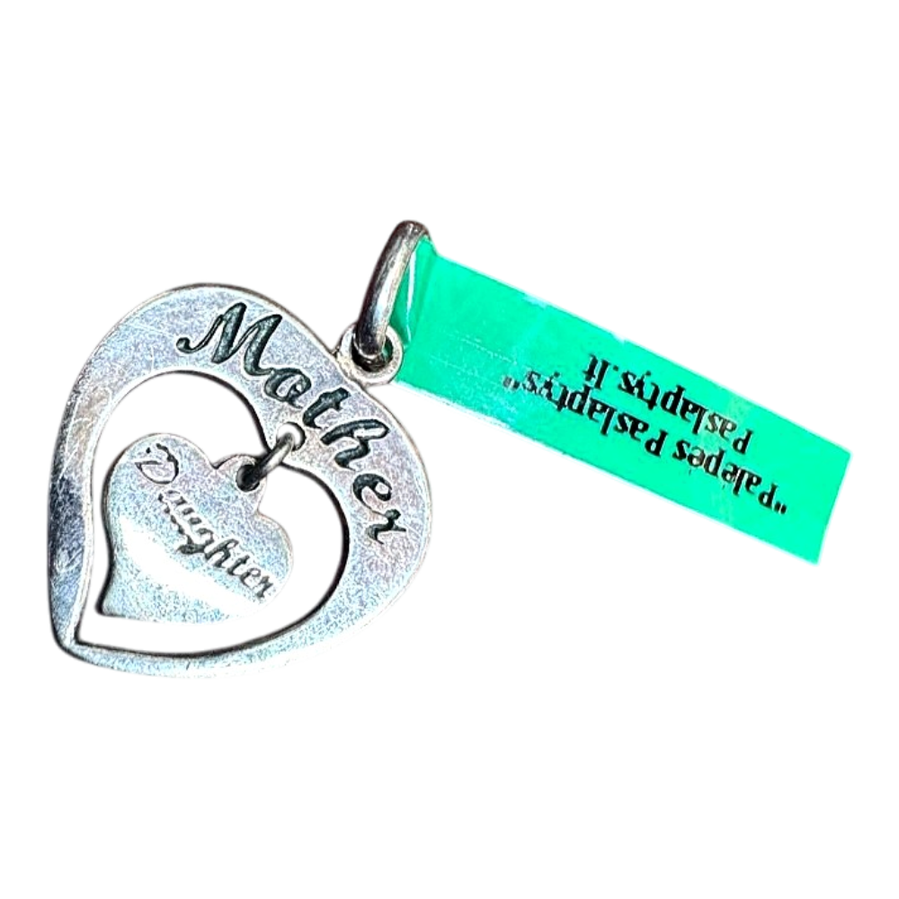 A lovely and symbolic vintage piece—a silver heart with a smaller heart inside. The larger heart is engraved with "Mother," and the smaller, freely moving heart is engraved with "Daughter."