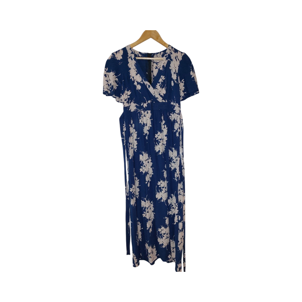 Blue floral wrap dress with short sleeves, casual elegant fit. Handmade, no brand.
