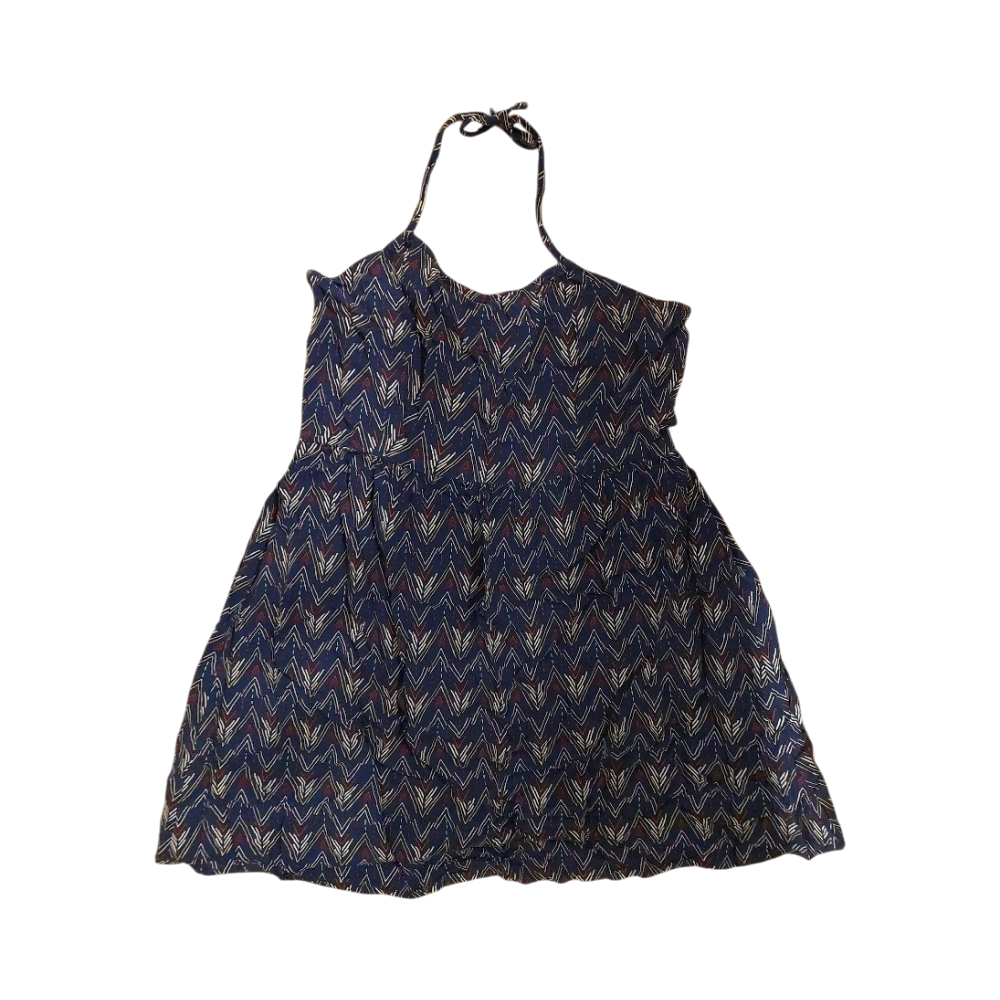 Sleeveless halter mini dress with zigzag print, lightweight and casual. Stretchy smocking on the back.