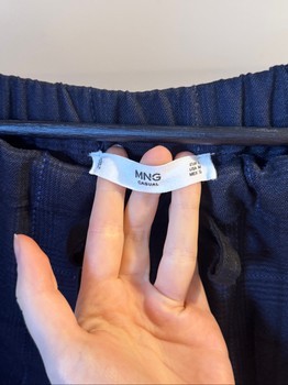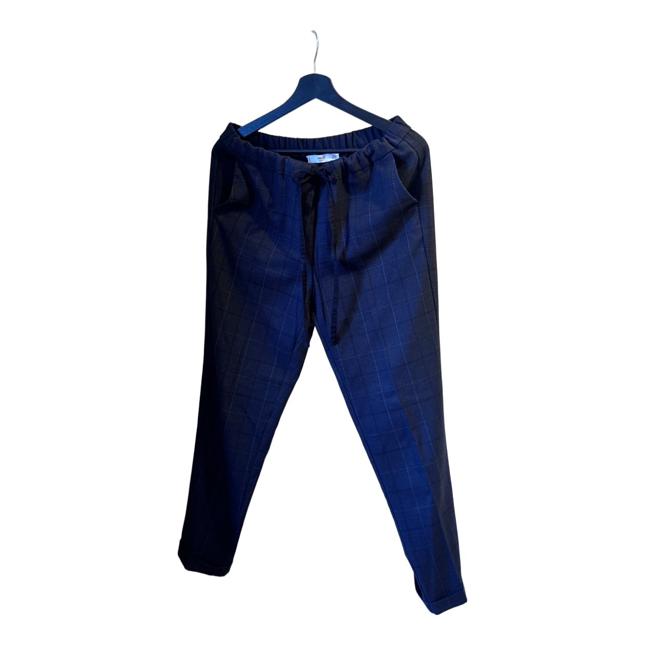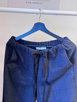 Navy plaid trousers with an elastic drawstring waist. Size L.
