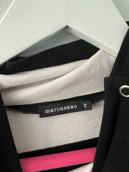In good condition, size XS. Black-and-white Marimekko striped shirt, the collar can be opened, snaps on the side. Size XS, length 67 cm and armpit-to-armpit measurement unstretched 48 cm. In neat condition