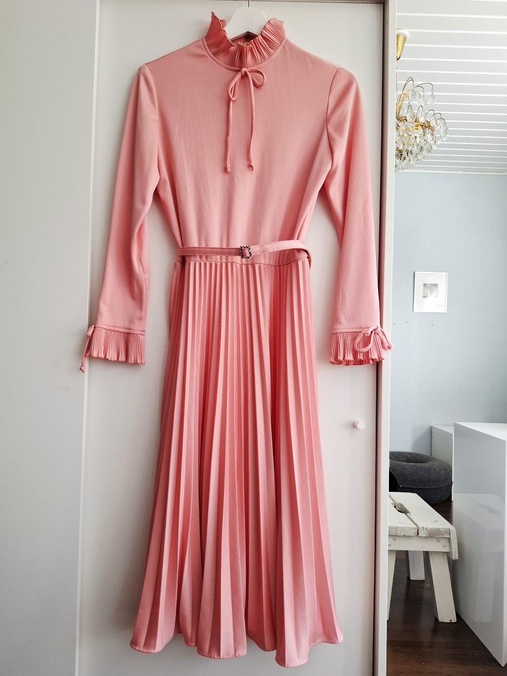 Pink midi dress with pleated skirt and flared long sleeves. Features a high neck with tie detail and a decorative rhinestone belt at the waist.