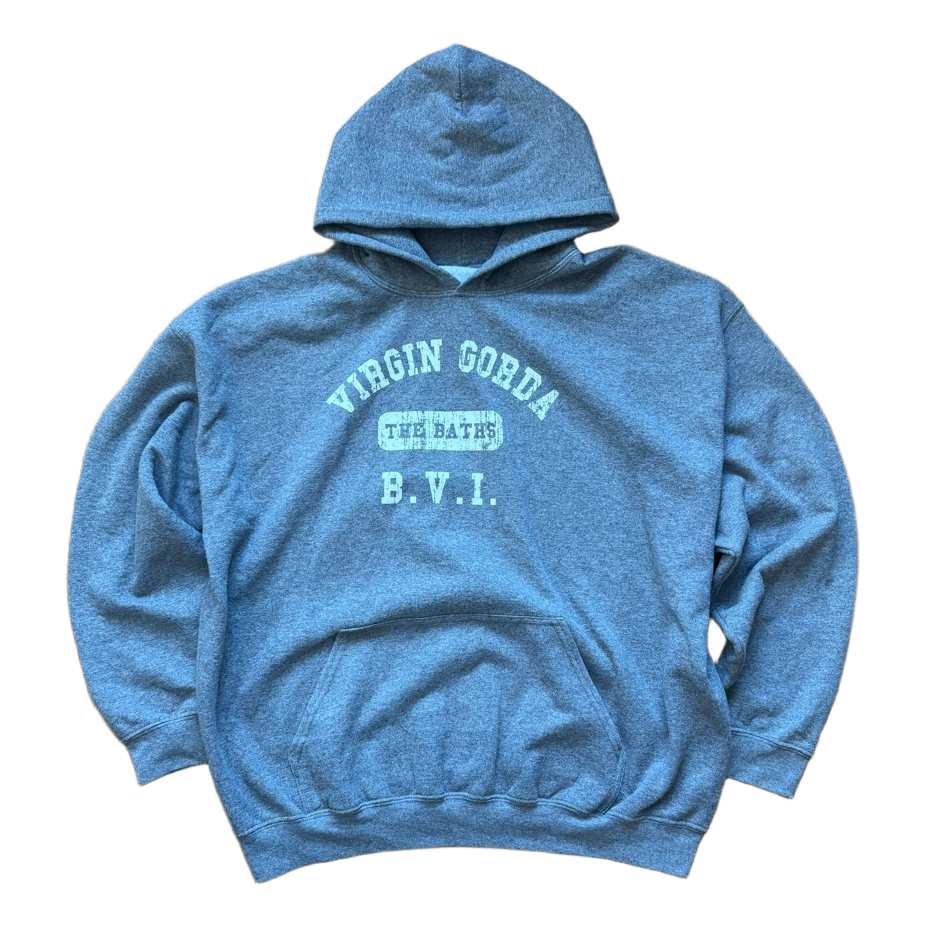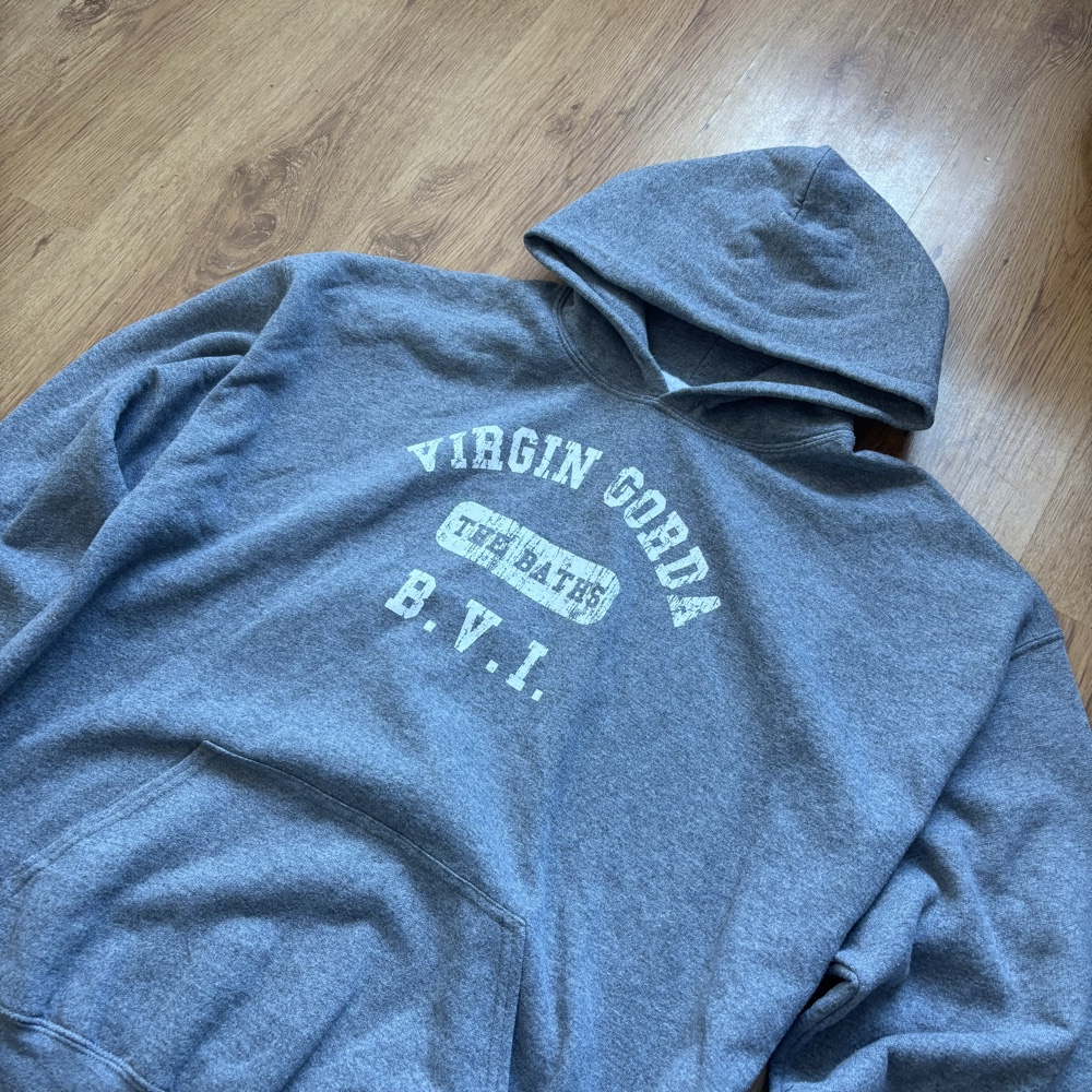 Grey hooded sweatshirt with a printed graphic on the front featuring Virgin Gorda and The Baths B.V.I. text.