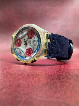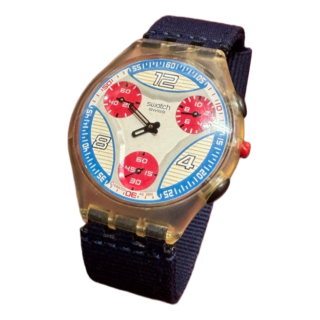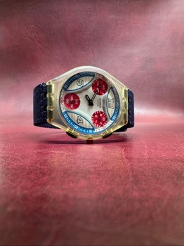 This is a relatively rare, slim Swatch model featuring chronograph functions and high-quality Swiss-made craftsmanship.