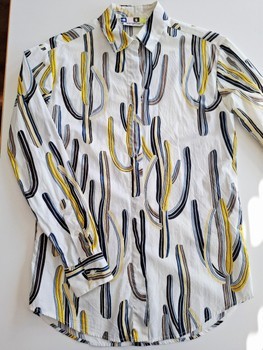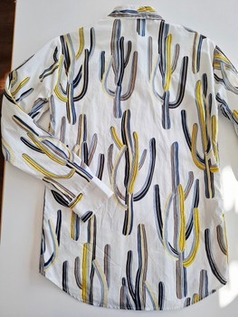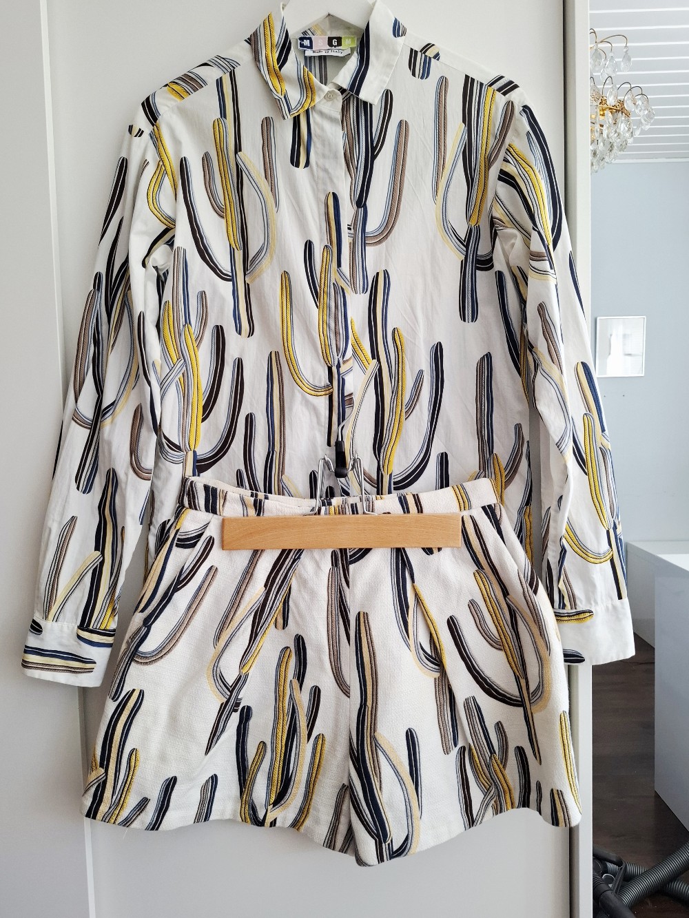 High-fashion high-quality designer two-piece set featuring a long-sleeved button-up shirt and tailored shorts. Both items have a white base with a cactus print pattern. Made in Italy.