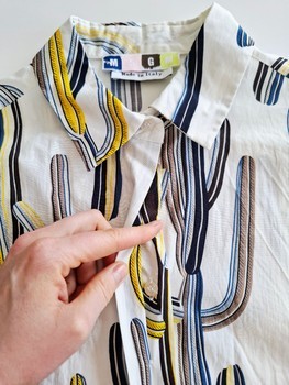 Classic buttoned shirt blouse 100% cotton poplin, measurements: shoulder-to-shoulder 45cm, underarm-to-underarm 48cm, length shoulder-to-hem 65cm, sleeve length 59cm. Shorts of slightly thick, non-transparent, "stiff" tweed material, zipper closure on the side, pockets on the sides, waist circumference 75cm, length approx. 37cm. Both sizes fit a size S.