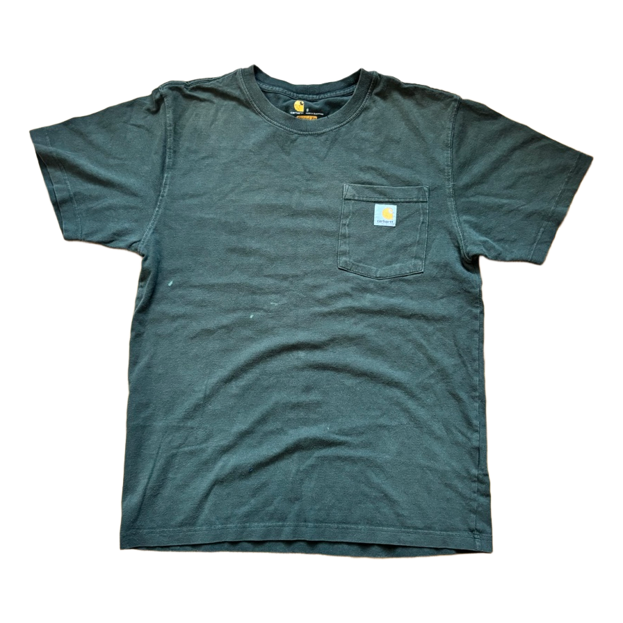 Green Carhartt short-sleeved t-shirt with a chest pocket and logo patch. Size S.
