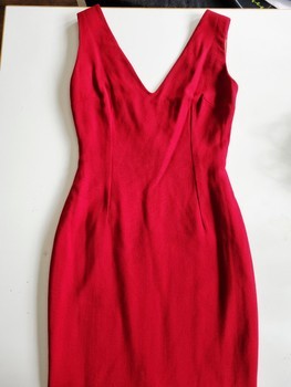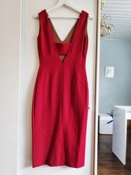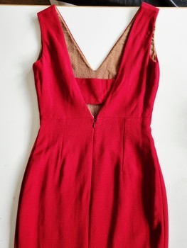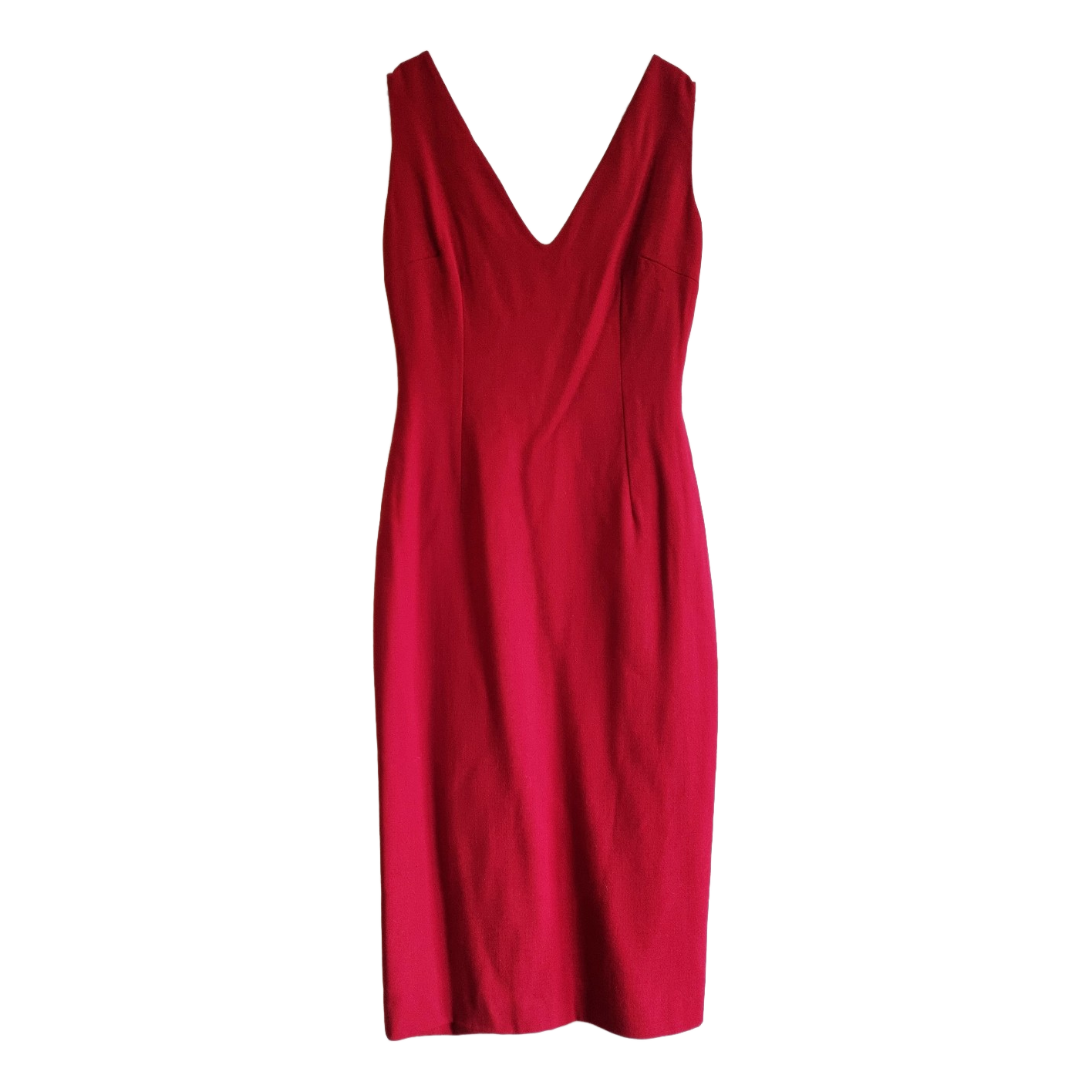 Sleeveless midi dress in red virgin wool, with a V-neckline and deep scooped back featuring a bra-covering strap with snap fastening. Back zipper closure and a classic slit at the hem. Lightly lined. Size fits S and M. Measurements: pit to pit 47 cm, width at waist 36 cm, width at hip 47 cm, length shoulder to hem 112 cm. Excellent condition. Check my other listings, combined shipping possible. Please do not make extremely low offers, thanks!