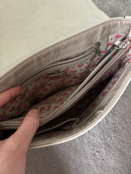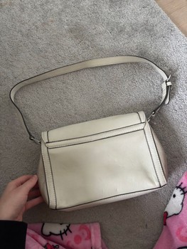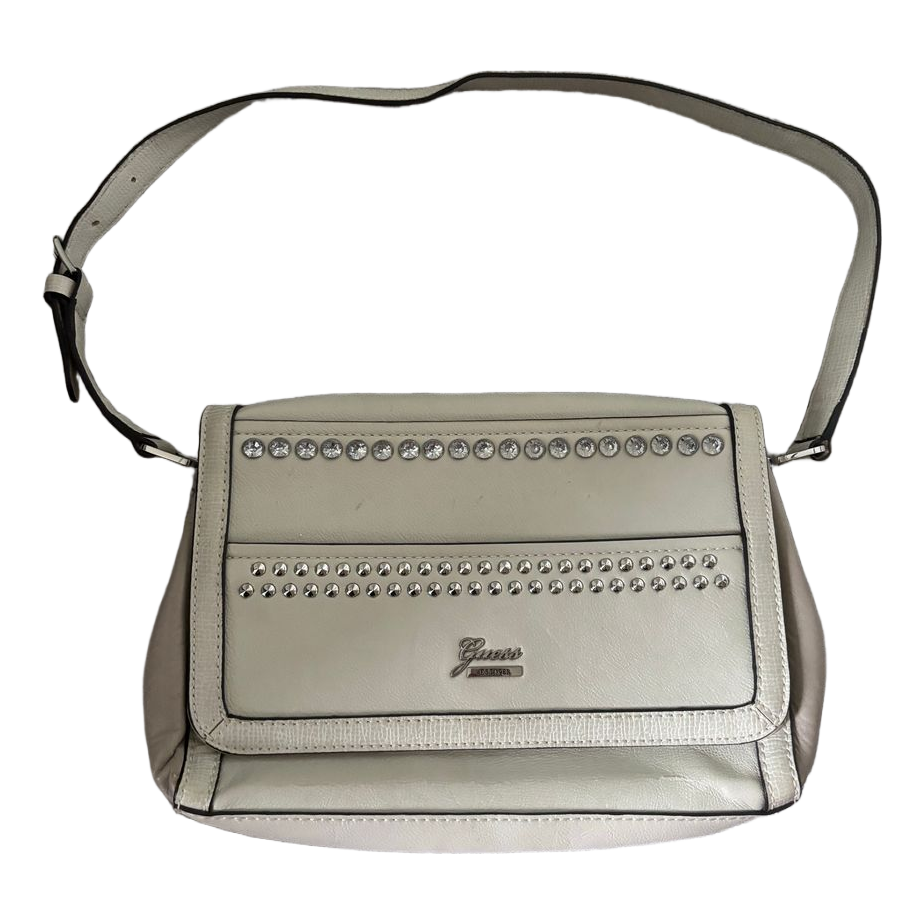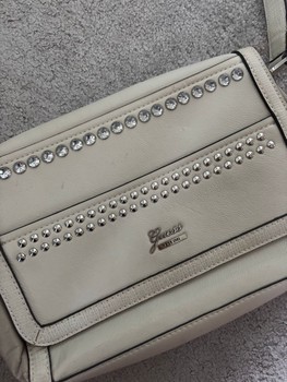 Beige Guess shoulder bag with rhinestone decorations and studs on the front. The bag has an adjustable strap and a heart-patterned inner lining. Y2K 2000s.