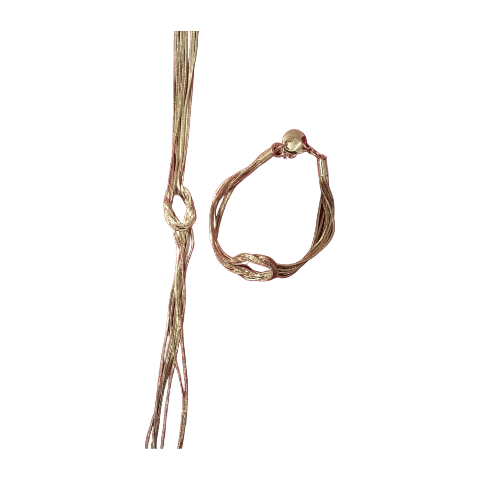 SNÖ OF SWEDEN's silver-colored jewelry set, which includes a long necklace with a length of 51 cm and a bracelet. The jewelry is decorated with a knot. The pieces have been worn once, so are like new. A storage case is included.