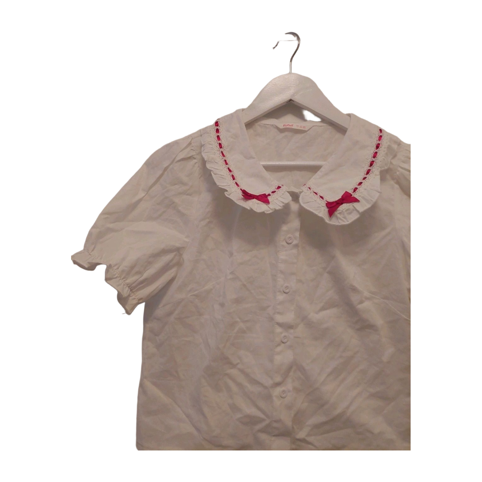 Short top. Wrinkled from storage. Unused. Size L, but for me slightly tight at the chest.