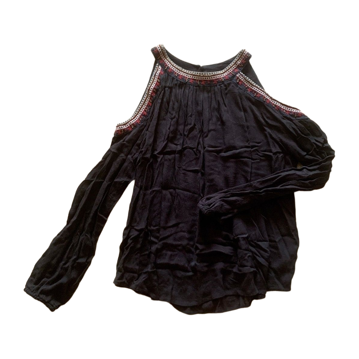 Lovely black blouse with open shoulders and embroidery at the neckline. Very little used.