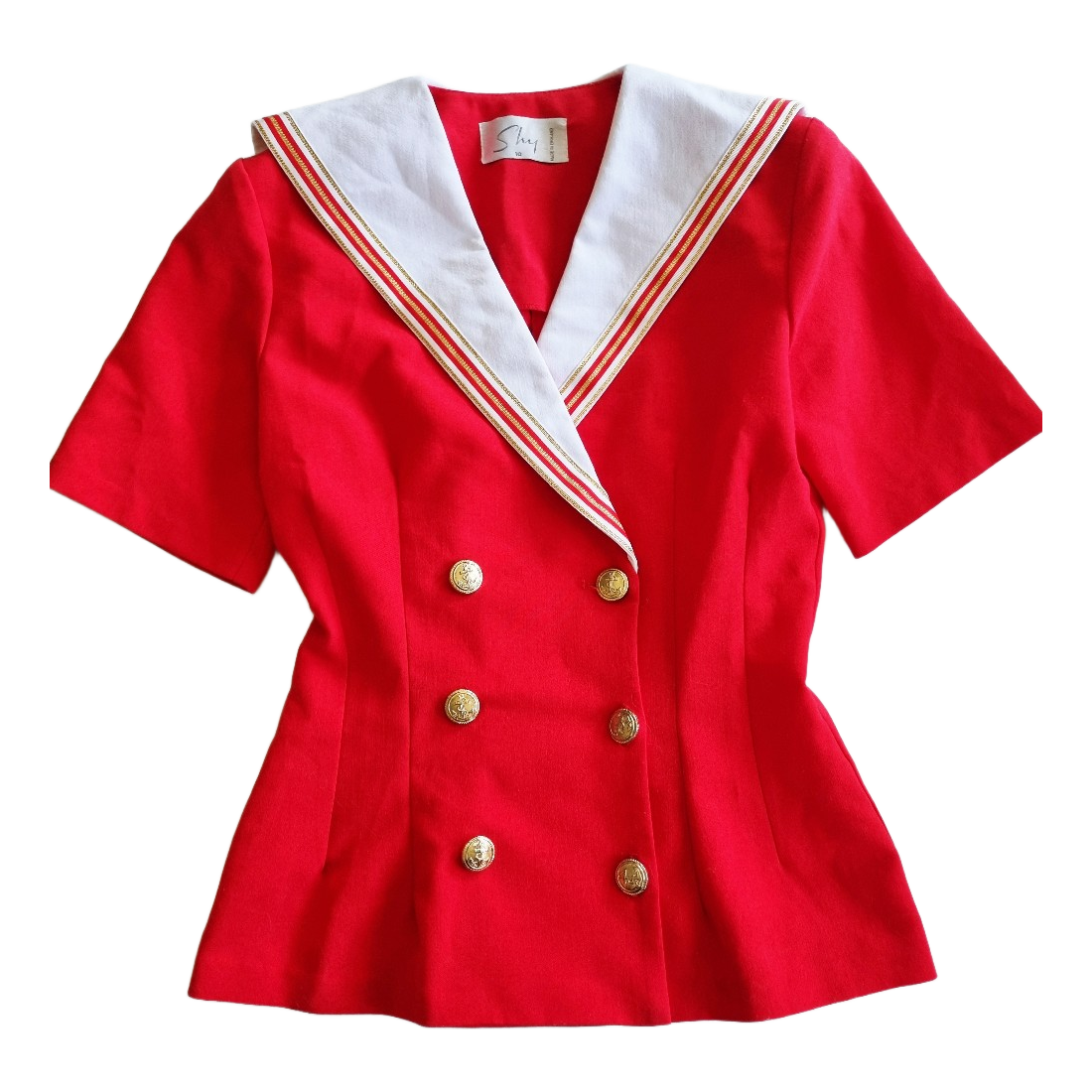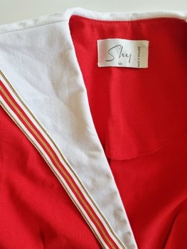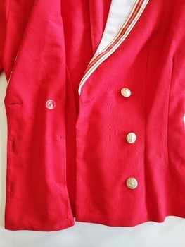 Red sailor style jacket with a large white collar and gold anchor buttons. Size equals xs-s current sizing