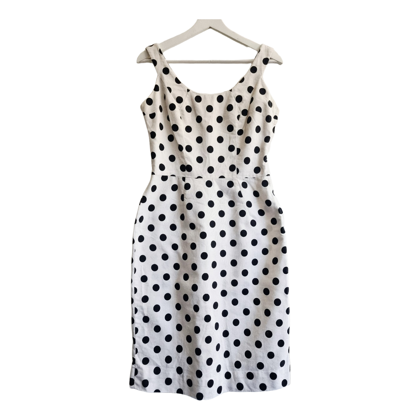 Sleeveless dress with a black polka dot pattern. Features a fitted shape and a side zipper closure.