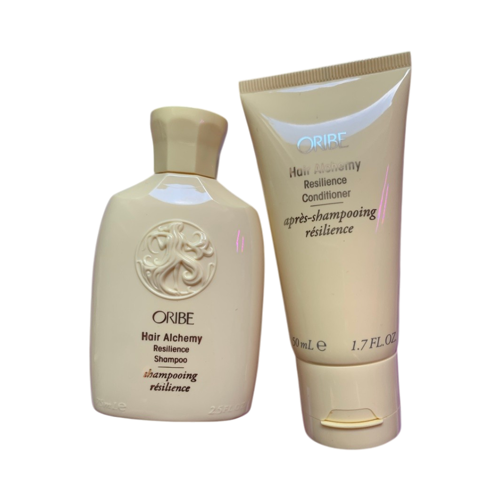 Oribe shampoo and conditioner set, travel sizes. Shampoo 75 ml, conditioner 50 ml. Both unused. Good sizes to test how they work on your own hair!