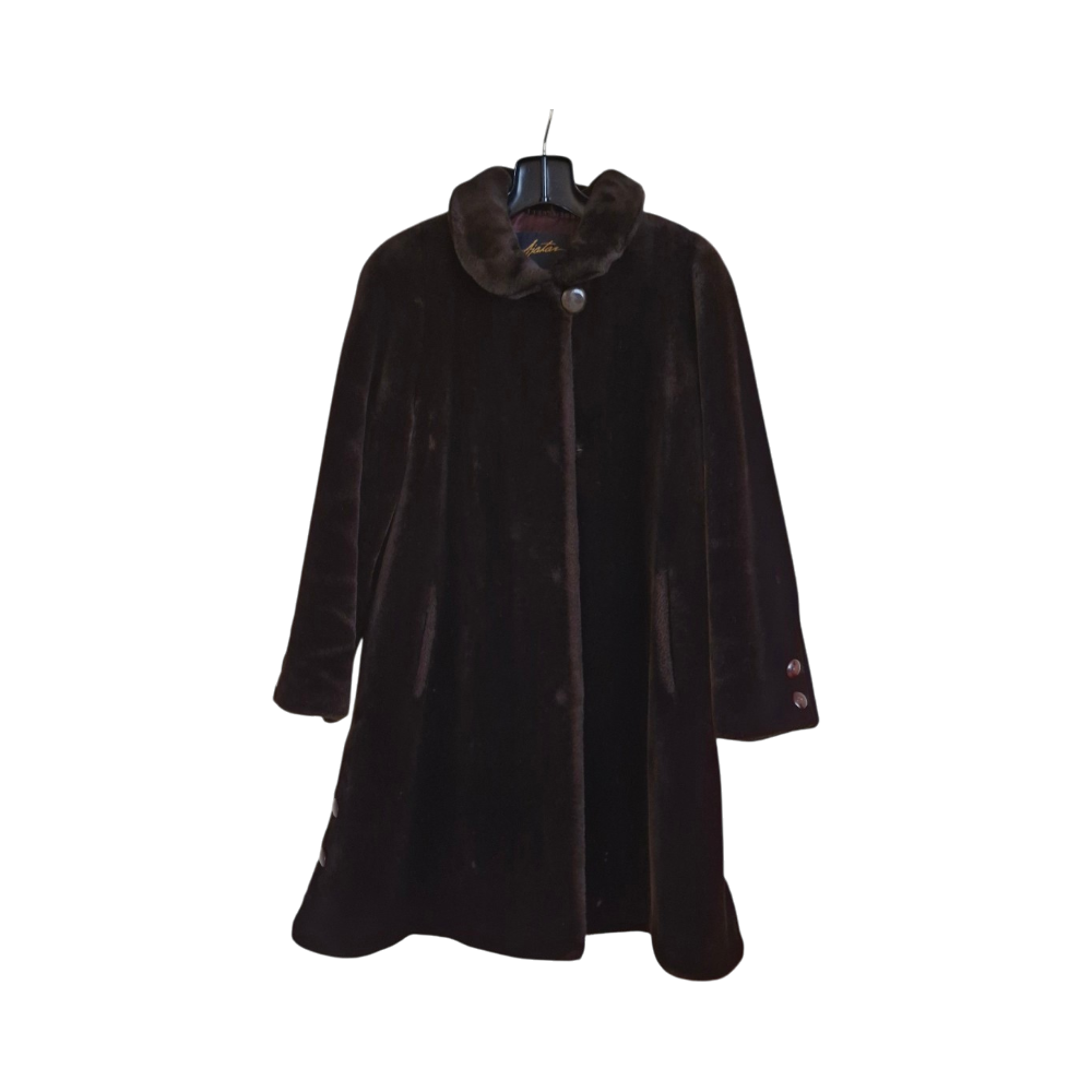 Knee-length brown women's faux fur coat, lined and buttoned. Bought 1999 from Ajattare at Forum in Helsinki. Condition impeccable. A-line, stunning coat. At the top one large button, otherwise front closure with three hidden hooks. On the cuffs and at the hem on the sides large buttons. Shoulder pads. Side pockets. Size 34/36