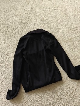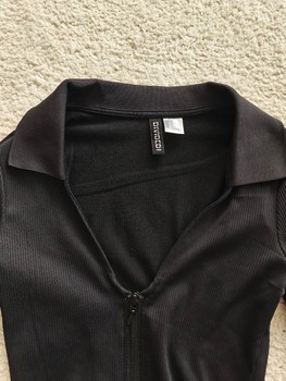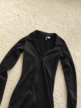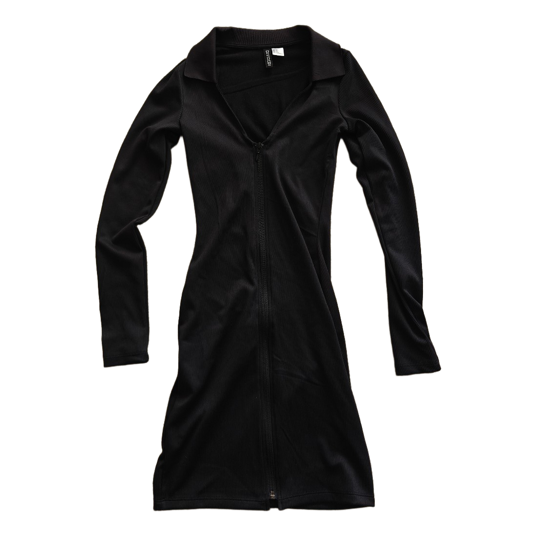 Black long-sleeved ribbed dress with a collar and a zipper at the front. Size XS. Very stretchy. Unused