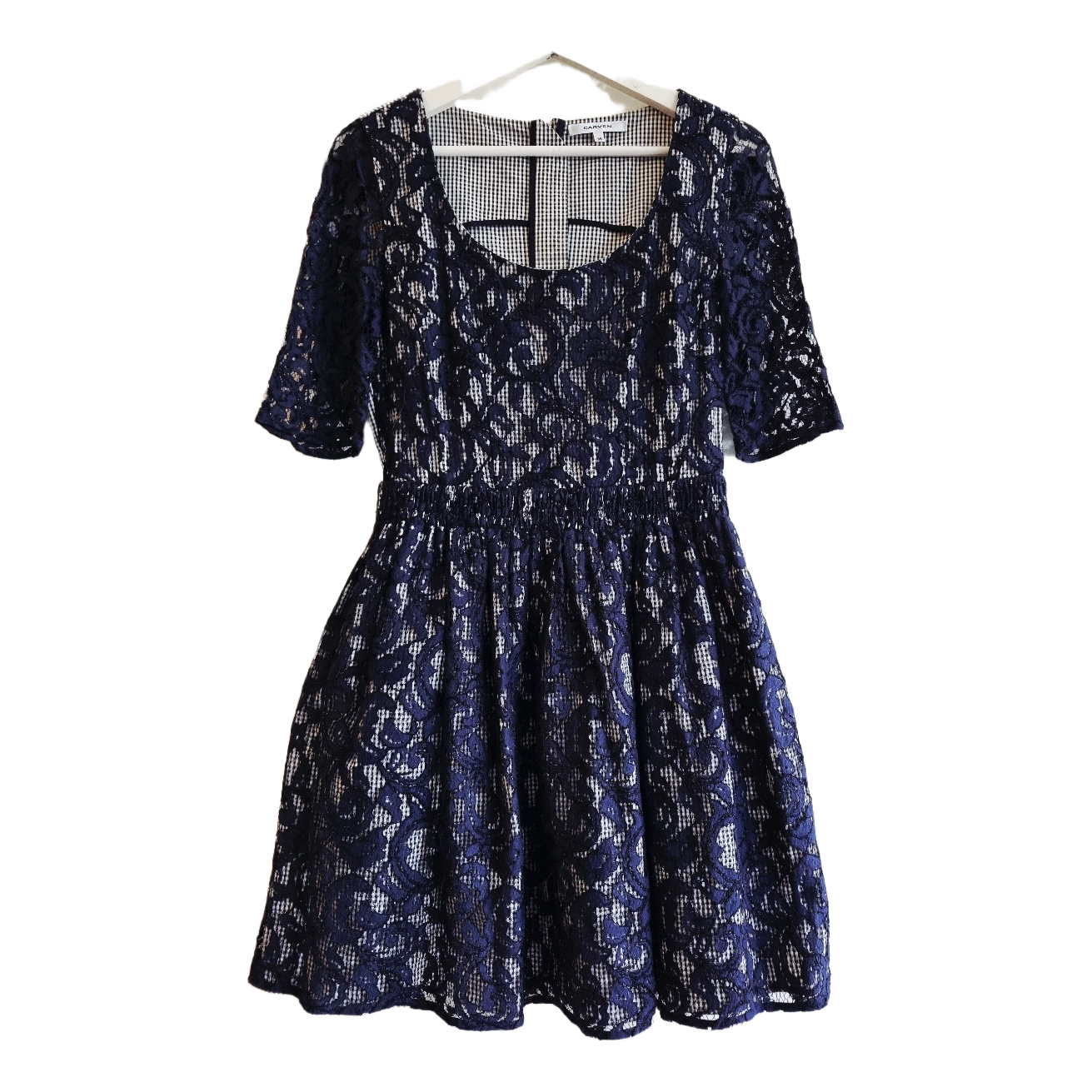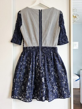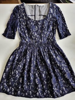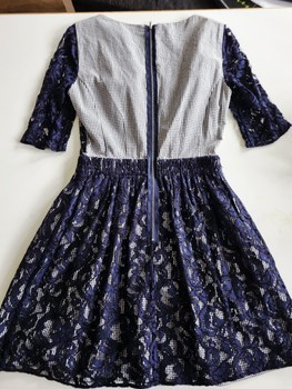 Navy blue lace dress with a white-and-black gingham cotton lining underneath. Features a back zipper closure and a cinched waist. Size 38. Measurements: shoulder-to-shoulder 37 cm, armpit-to-armpit 45 cm, width at waist 35 cm (stretches a little), length shoulder-to-hem 85 cm. Excellent condition, no faults. Check my other listings, combined shipping possible. Please do not make unreasonably low offers, thank you!