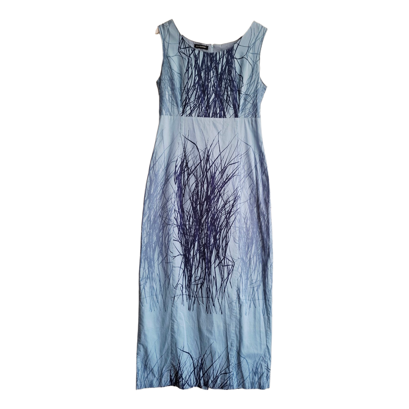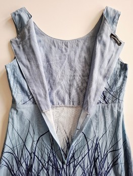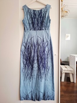 Rare Marimekko vintage piece: Light blue sleeveless maxi dress with a dark blue nature print. Features a back zipper closure and a slit at the hem.