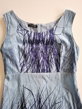 Beautiful print and a lovely cut as well. Lightly lined at the top, back zipper closure and a beautiful slit.