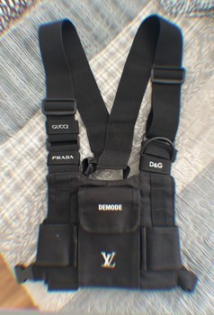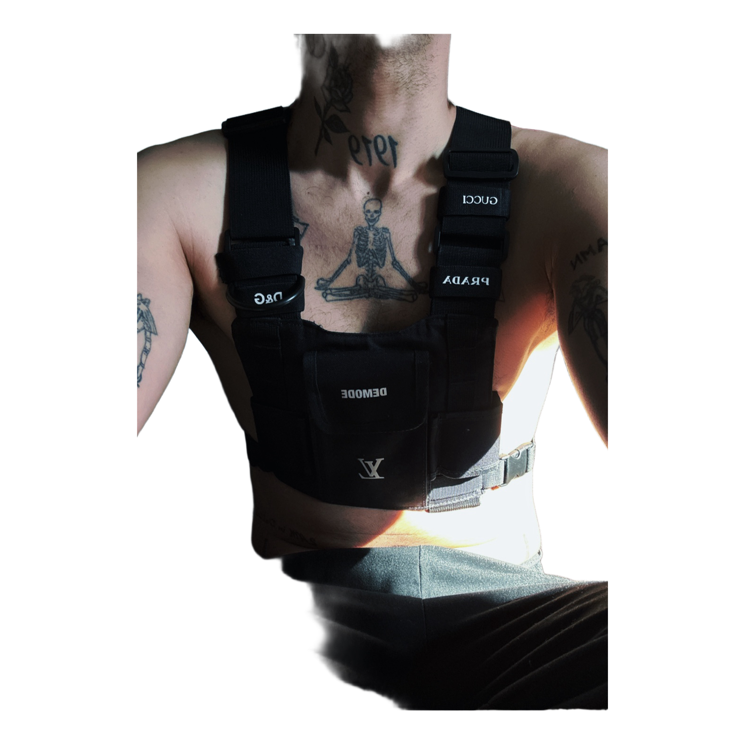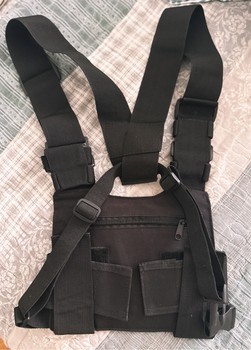 Tactical chest rig with multiple pouches, adjustable straps, and buckle closures. Features various brand logos.