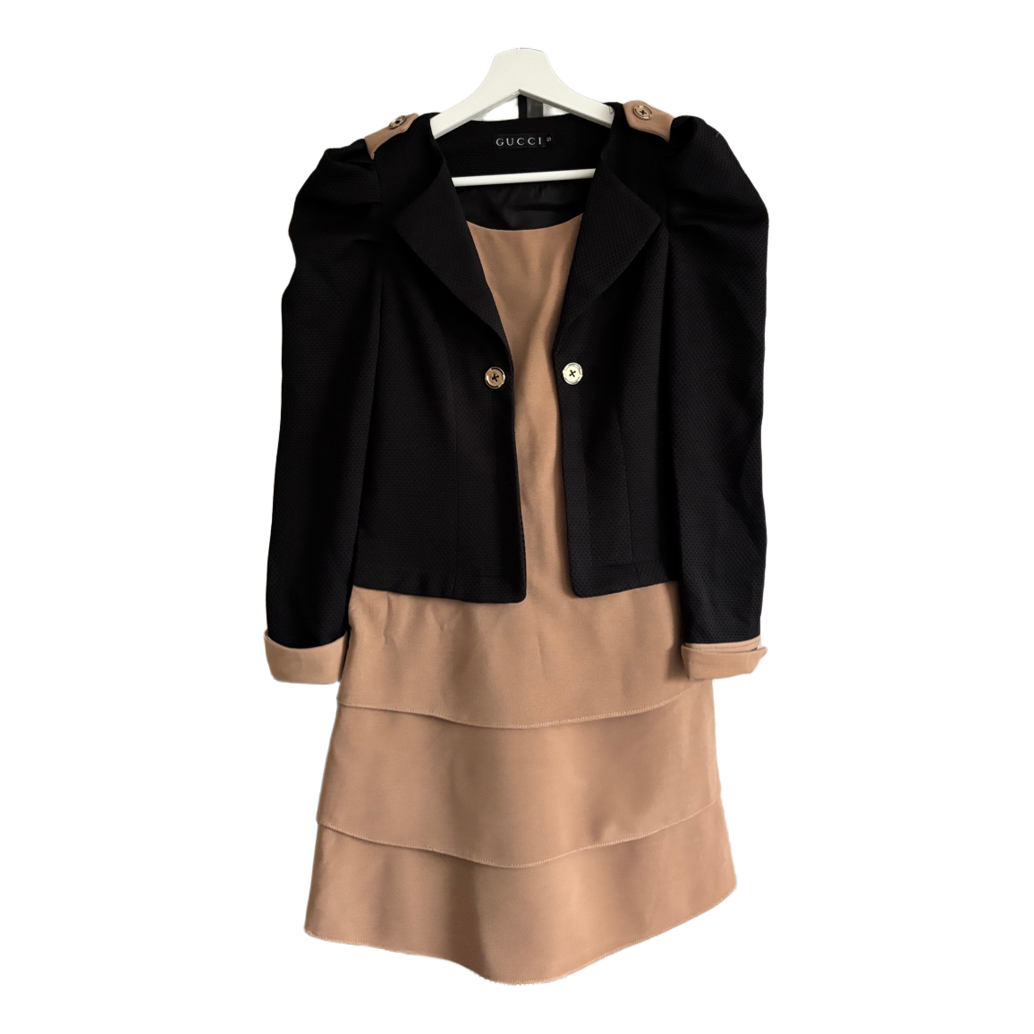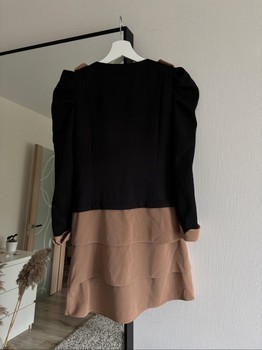 Black and beige dress with a layered design. Features a black jacket-style bodice and a beige skirt. Size S.