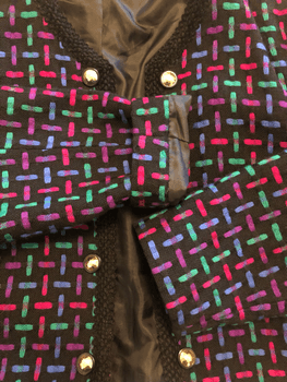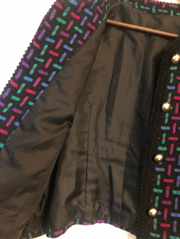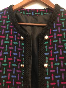 Short, lined patterned vintage jacket with decorative buttons. No information about brand, size M. Sleeve length 57 cm, shoulder-to-hem 51 cm and armpit-to-armpit 54 cm