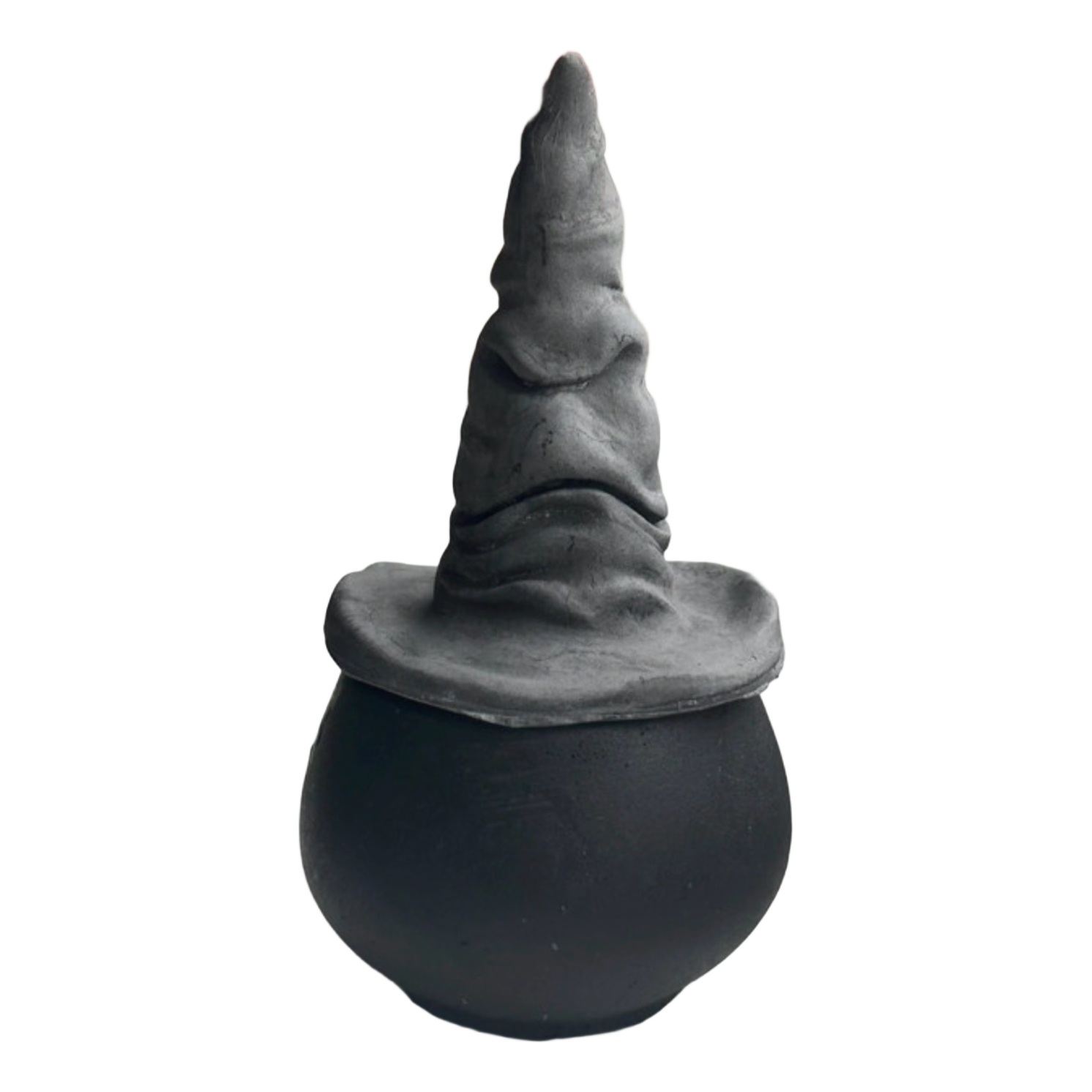 Decorative black cauldron with a removable sorting hat lid. Features cork padding on the base. Harry Potter jewellery cauldron or storage box or you can use it for DIY candle.