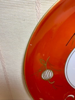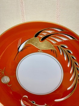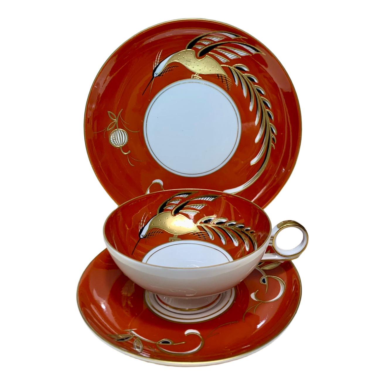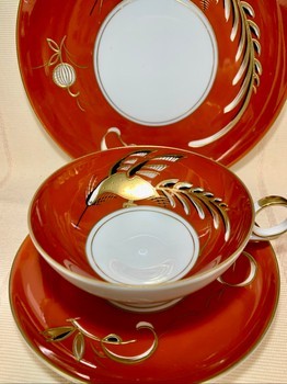 Elegant tea cup and saucer set with gold phoenix detailing. Features a red and white design. Wellendorf, kollektsiooni ese.