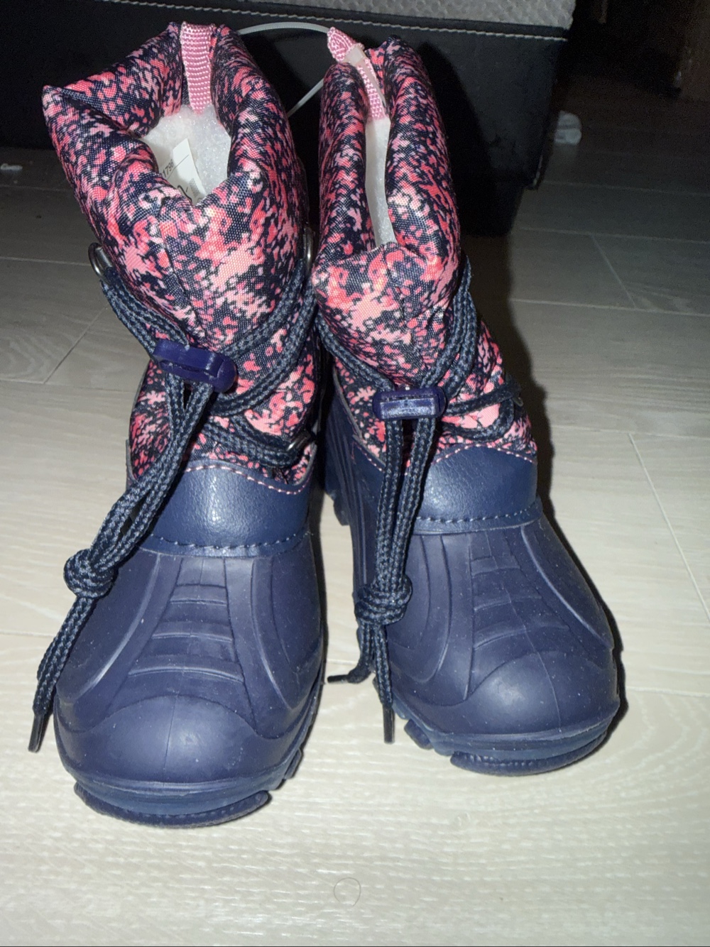 Kids winter boots with navy blue rubber base and pink patterned upper. Featuring drawstring closure and 3M insulation.