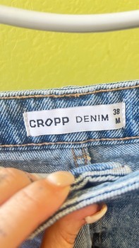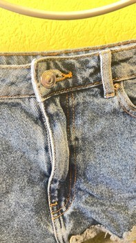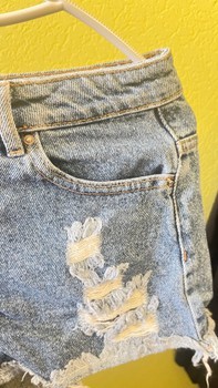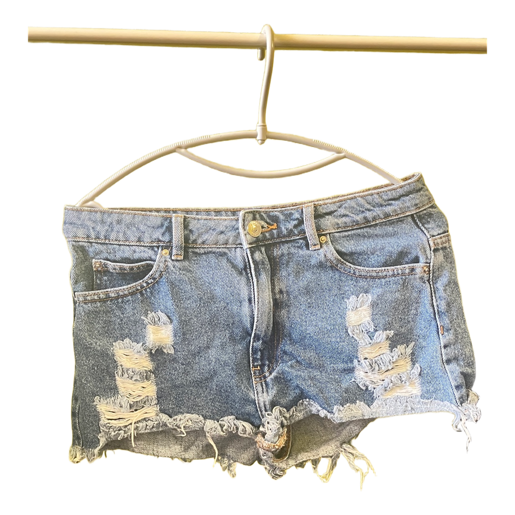 Blue denim shorts with distressed detailing and frayed hem. Size 38.