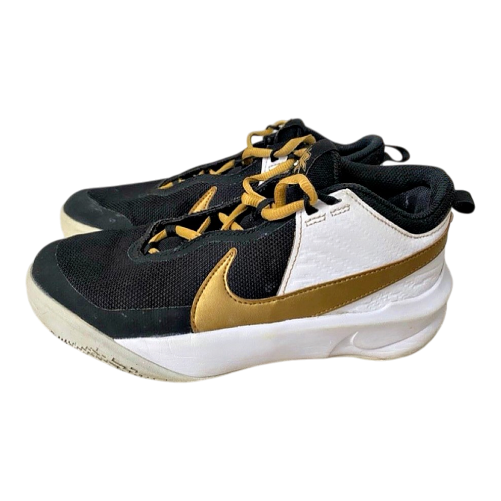 Black and white sneakers with gold Nike swoosh. Features gold laces and a white sole.