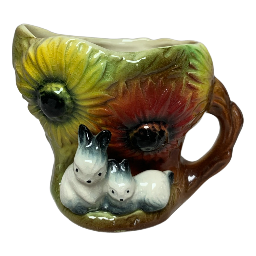 Ceramic mug featuring sunflowers and two small rabbits. Multicolor design with textured detailing. Marked Eastgate England on the base. Olemas kraklee.