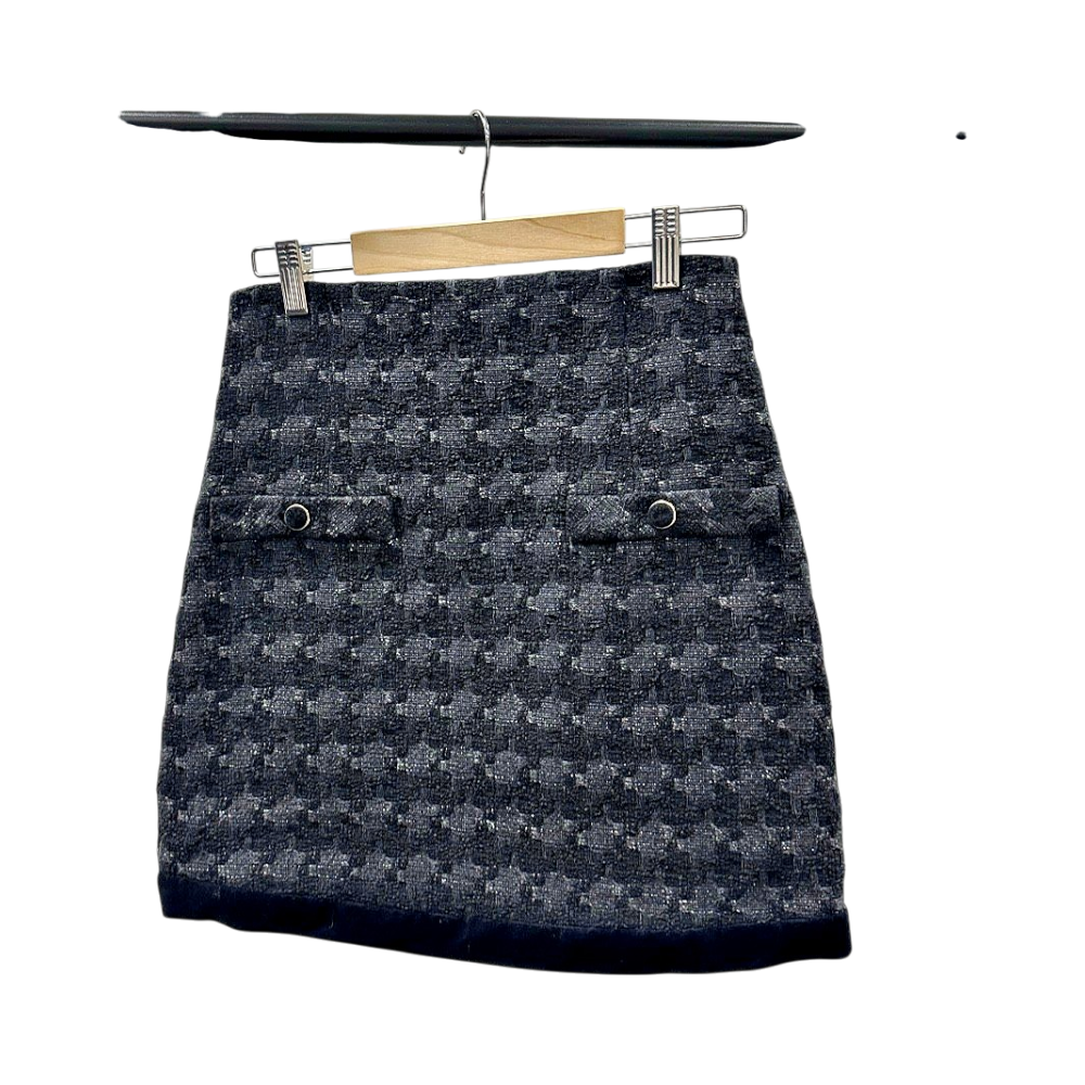 Stylish grey tweed skirt featuring two front pockets. Size 36 with original tags attached.