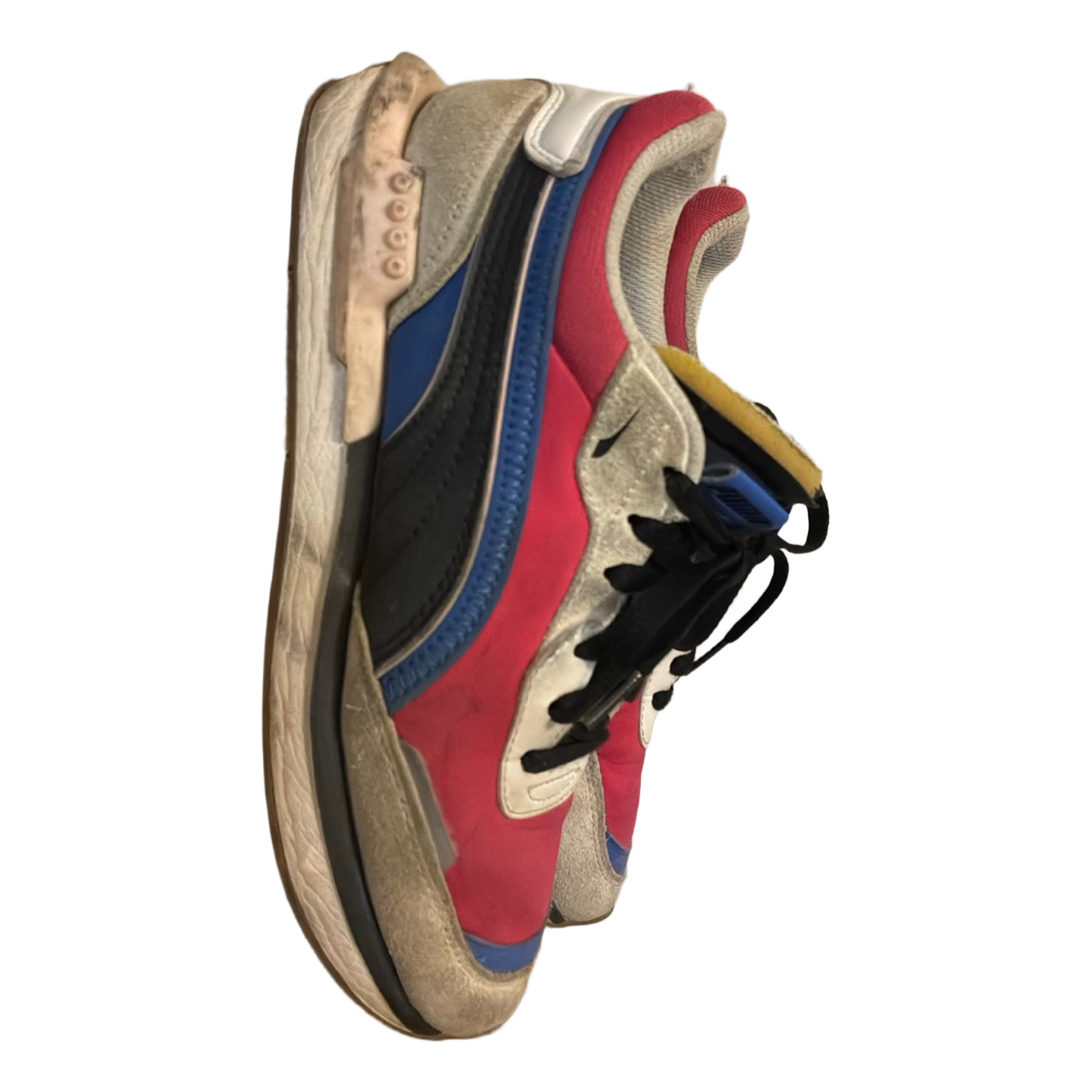 Puma sneakers featuring a vibrant color palette of pink, blue, black, and off-white details. Features lace-up closure and thick soles.