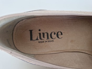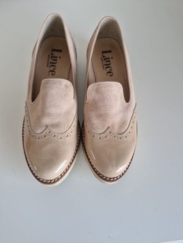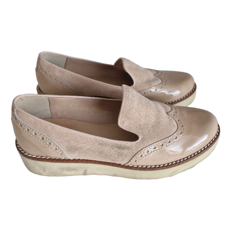 Beige Lince loafers with a combination of suede and shiny leather. Size 37. Some darkening on the suede parts and on the sides of the platform. Can be washed off.