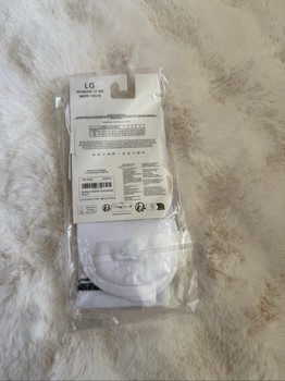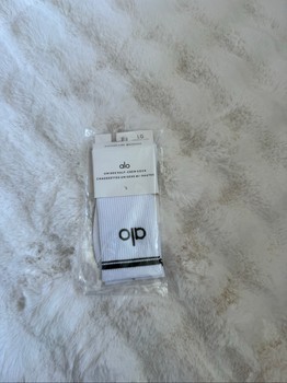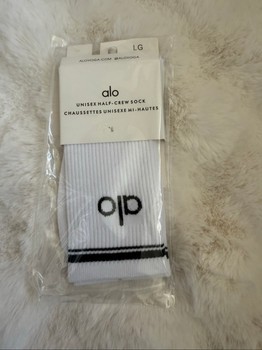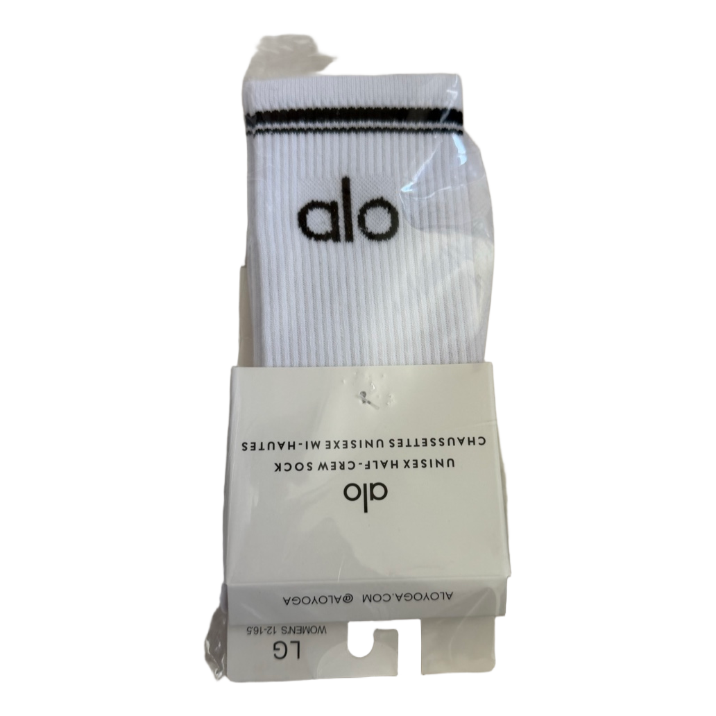 Unisex half-crew socks in white with black details and logo. New with tags in original packaging, size LG.