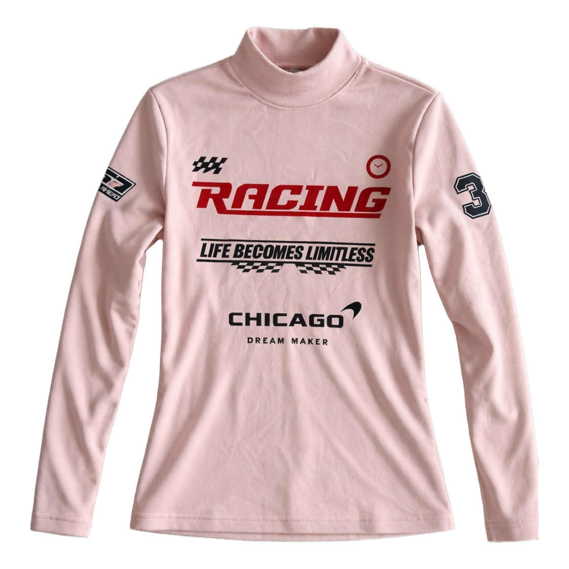 Pink long-sleeve top featuring graphic prints on the chest and sleeves.