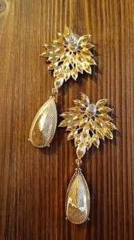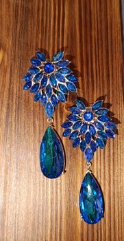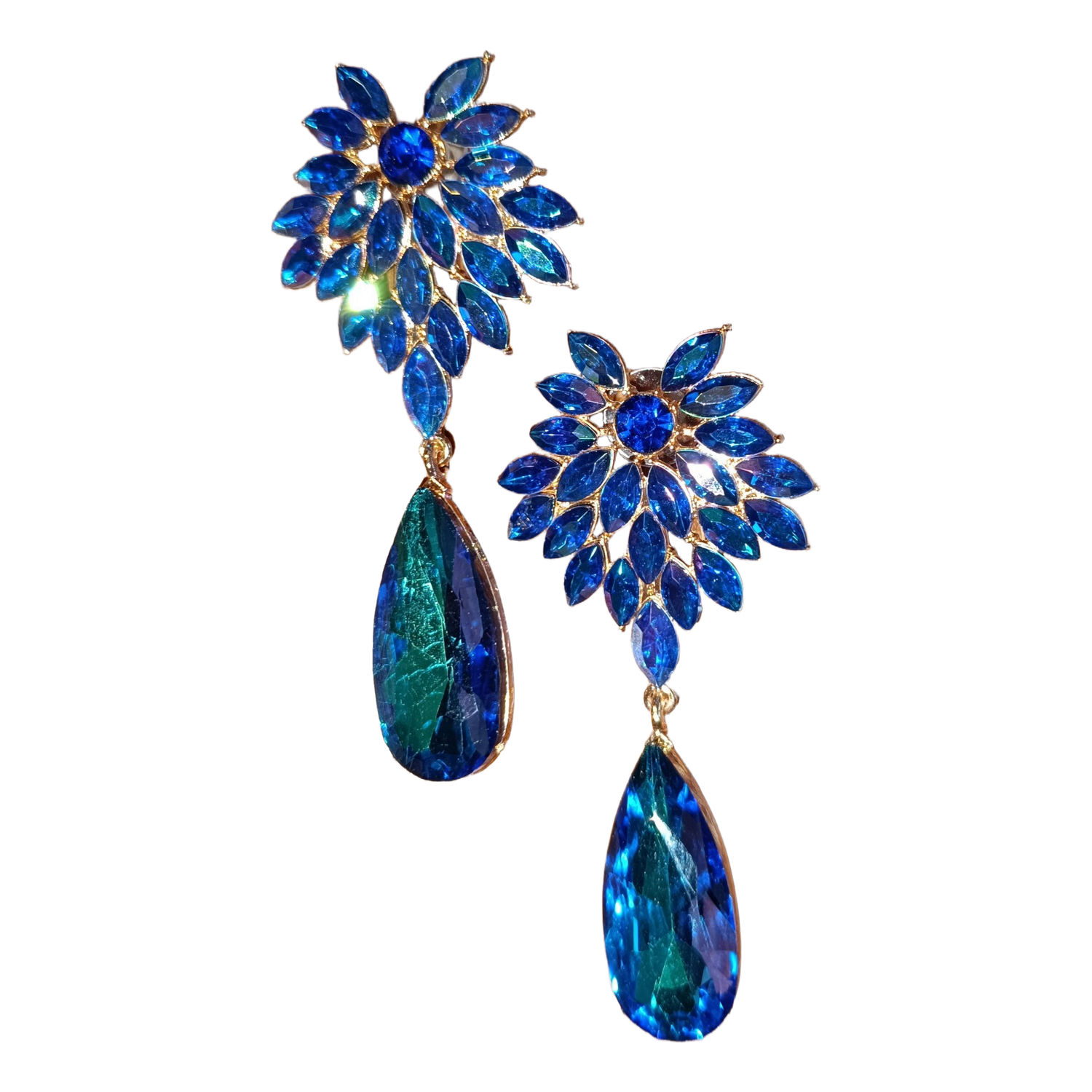Elegant earrings featuring blue teardrop stones and decorative flower-shaped crystal clusters. Gold-tone setting.