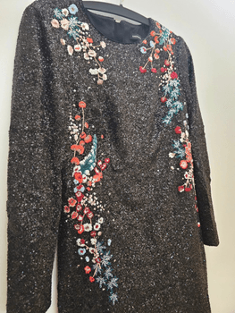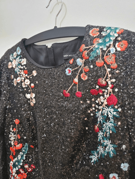 Features floral embroidery with sequins. Back zipper closure.