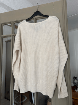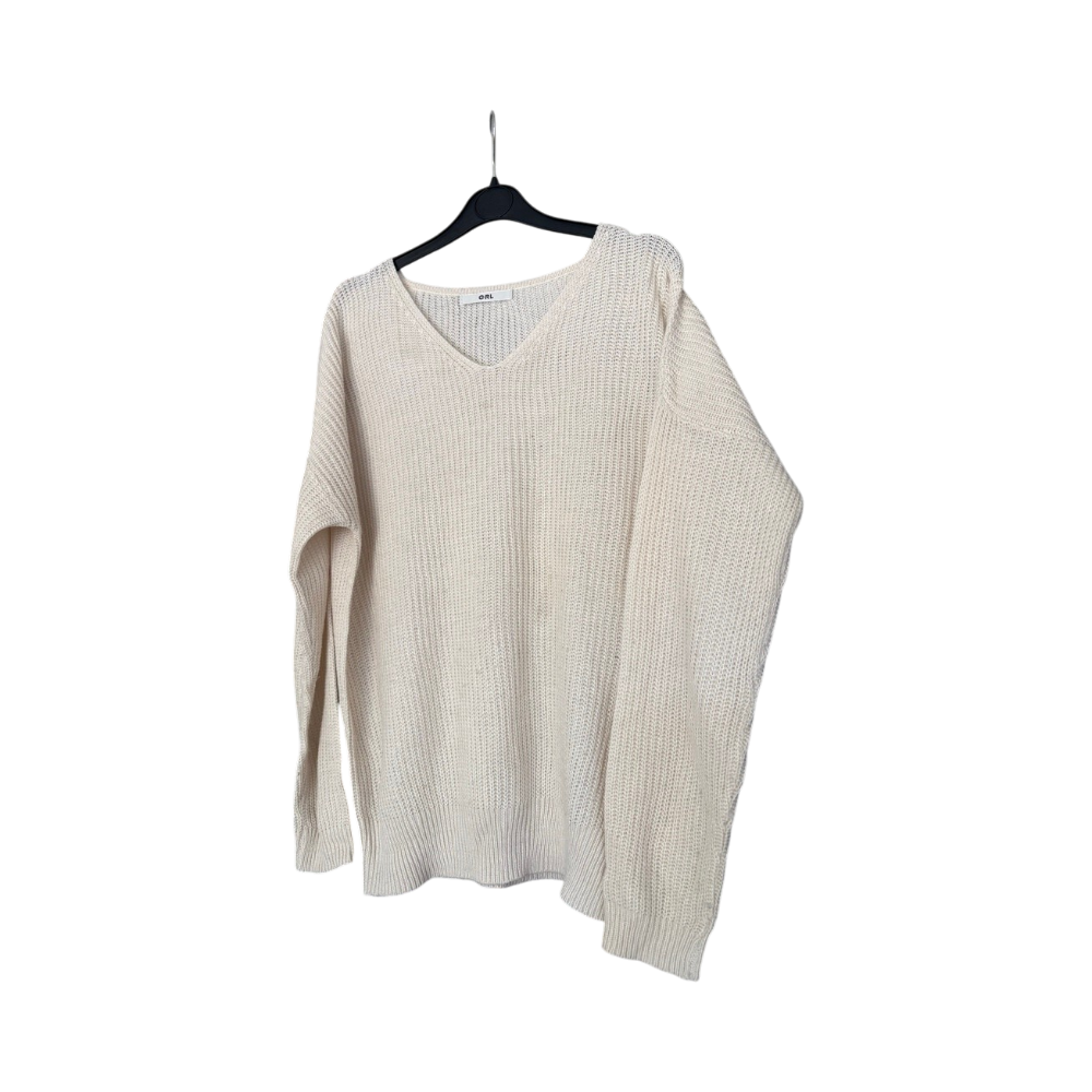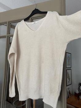 Valkoinen neulepaita, jossa imarteleva V-pääntie, japanilaiselta GRL-merkiltä. Hieman oversize-mitoitus rennolla istuvuudella. Hyvässä kunnossa. Koko M.