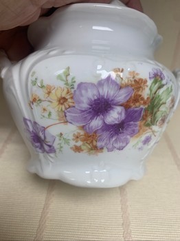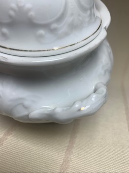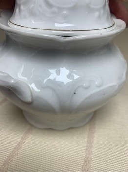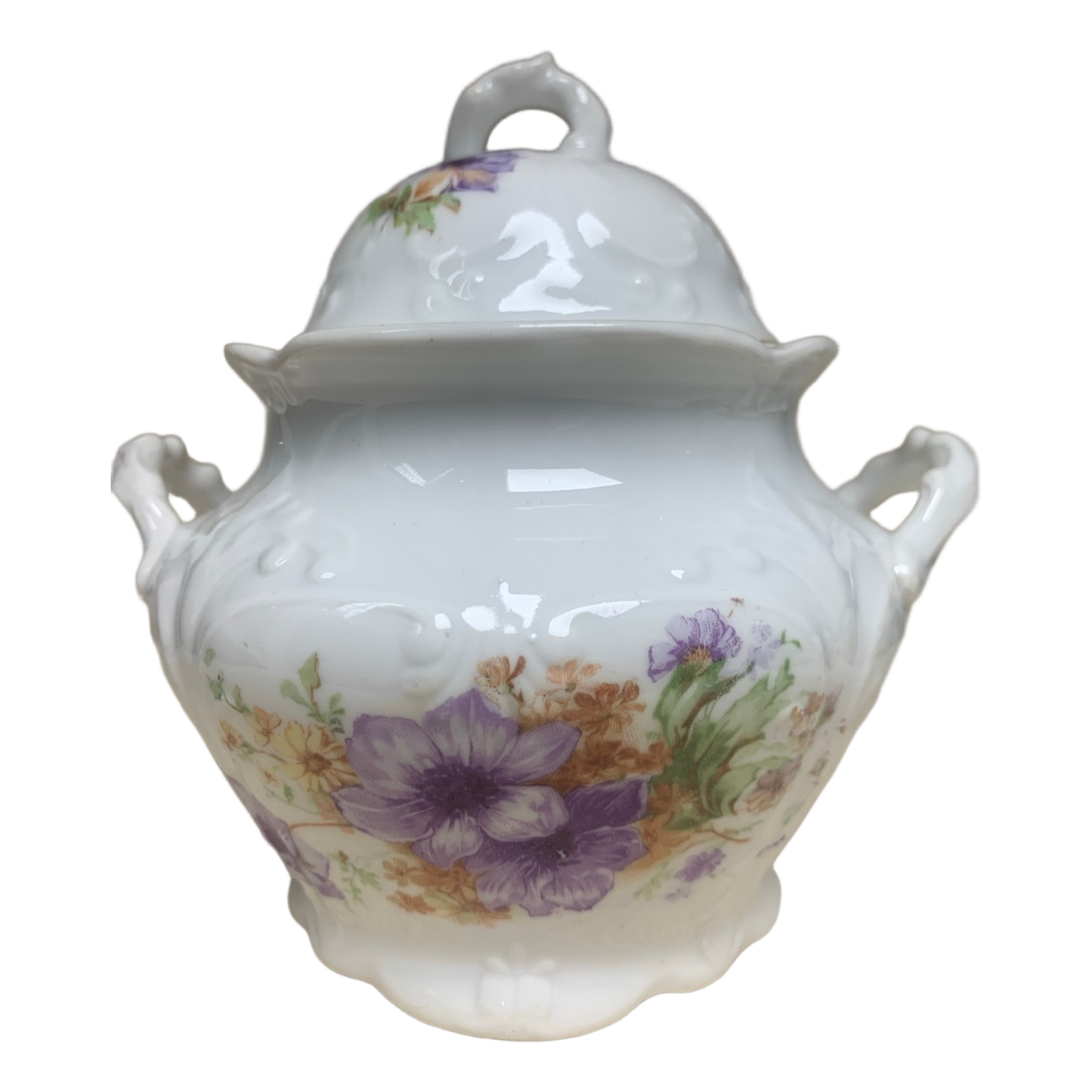 White porcelain sugar bowl with a floral pattern and lid. Features embossed detailing and subtle gold trim.