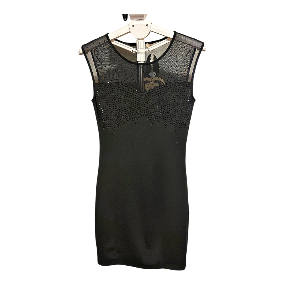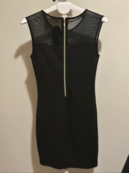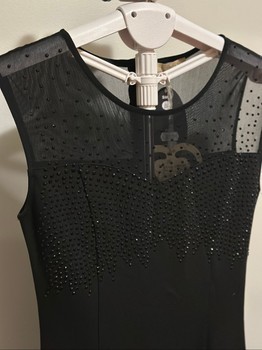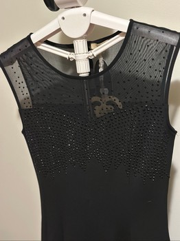 Black mini dress with sheer mesh top. Features embellishments on the bodice. Has a back zipper closure.