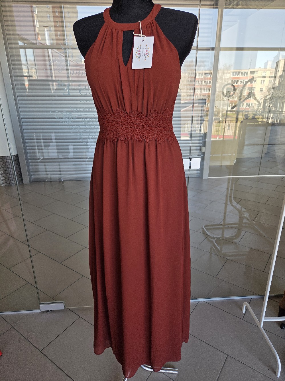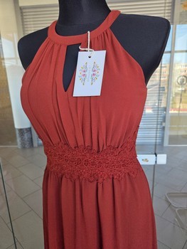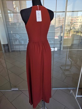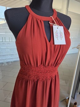 Burgundy maxi dress with a halter neckline and lace detail at the waist. Featuring a zip closure at the back. Size 34.